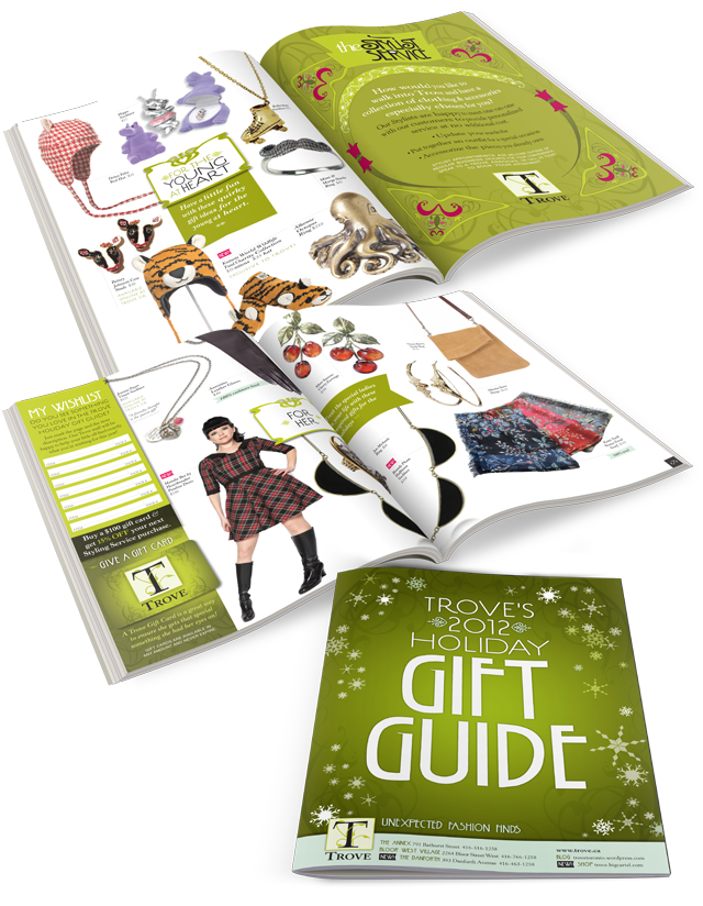 i pitched the concept of a gift guide two holiday seasons ago as a change from the regular newsletters i design for trove. the owners at trove, carolyn and barbara, loved the idea that it could be made into an online flipbook (sadly for me, no real printed copies).
