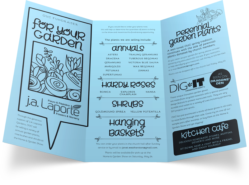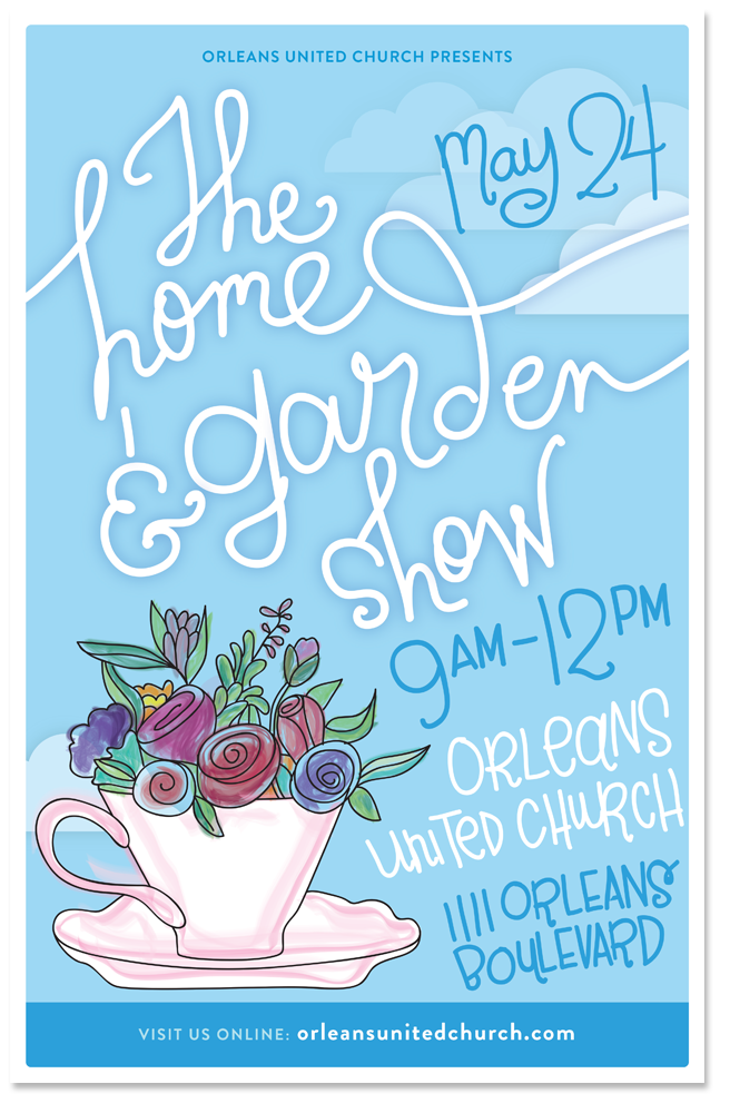 this year the orleans united church decided to host a new event where they would sell flowers & plants, as well as, have local crafters sell their goodies. i was brought back in to help with design to help spread the word. may flowers mean cheery colours, organic lines and airiness. with this concept in mind, i came up with an illustration of flowers in a teacup- merging the main focus of the the event- flowers, with the other offering of the ouc- a little cafe where the shoppers can grab a tea and some homemade goodies. i used brushstrokes in illustrator to mimic the feel of watercolours so they appeared softer than a flat 2d shape. the poster was the first piece to roll out as advertisement in the community.