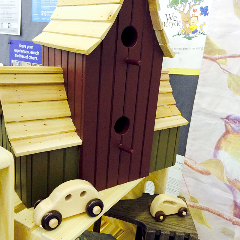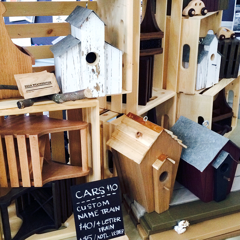 i set up the display for my dad’s woodcrafts. he is a cabinetmaker by trade, and has recently spent his spare time making birdhouses, drink caddies, letter trains and toy cars. have a look at the photos of his product. he is the most talented dude i know- tradesmen are just so skilled! i even picked up a birdhouse for myself- white with a copper roof made with my grandfather’s copper.