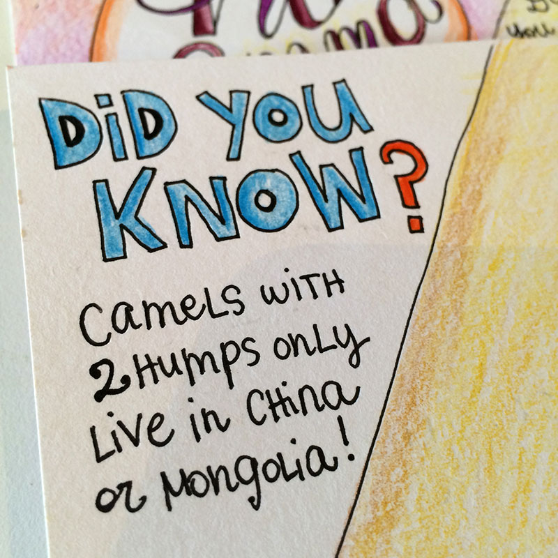 i wrote a little story about my camel, who i named clara. after having drawn her with 2 humps, i did some research and found out that the 2 hump camels apparently only live in china and mongolia, so i worked that in to the story. i had clara the camel go on a little adventure with her donkey friend into the mountains; i made sure to look up the animals who live in the area to be accurate (not that an 8 year old would know). this was just meant to be a starting point to get emma thinking about a kind of story she could write.