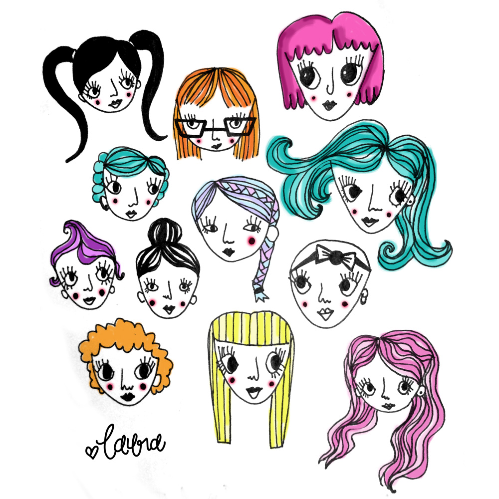 for tonight’s before bedtime doodle, i somehow ended up drawing a 12-pack of weird little girl heads. i started by the loop for the head shape, then big eyes, some weird long noses, followed with the little mouths. after the doodles were done, i brought them into photoshop to add some bright colours to the hair. that’s it, that’s all.